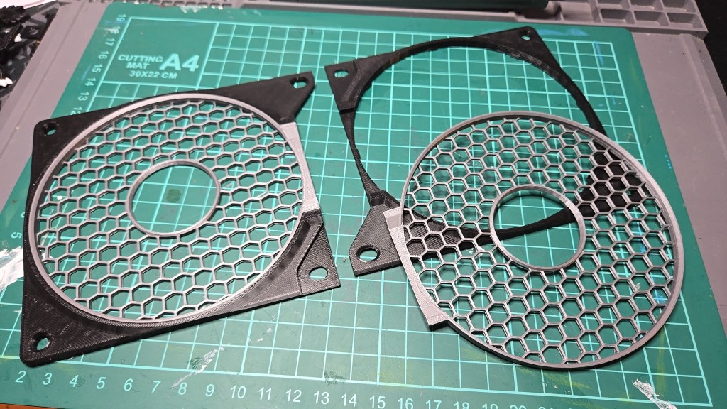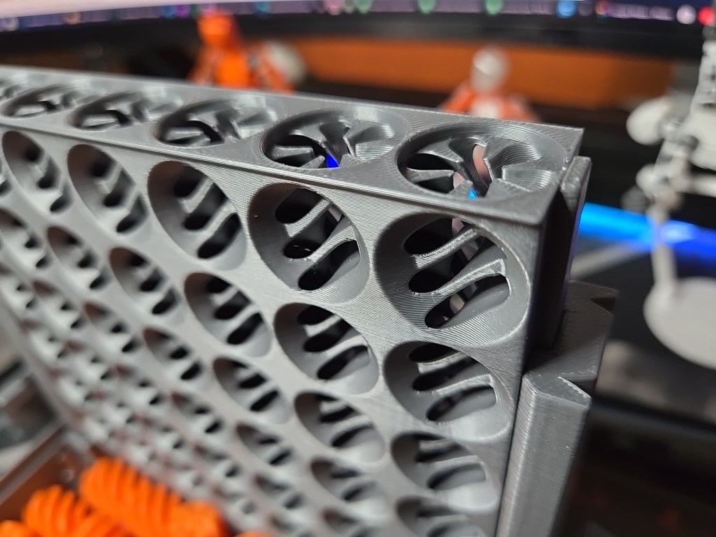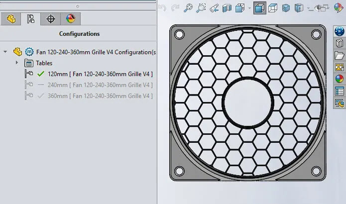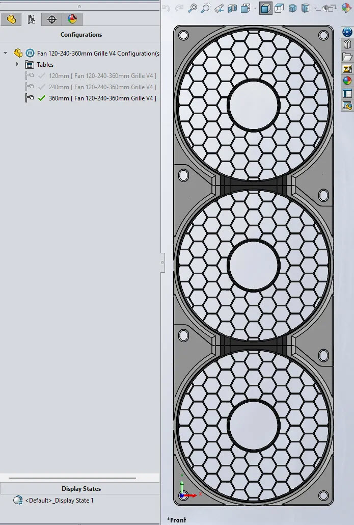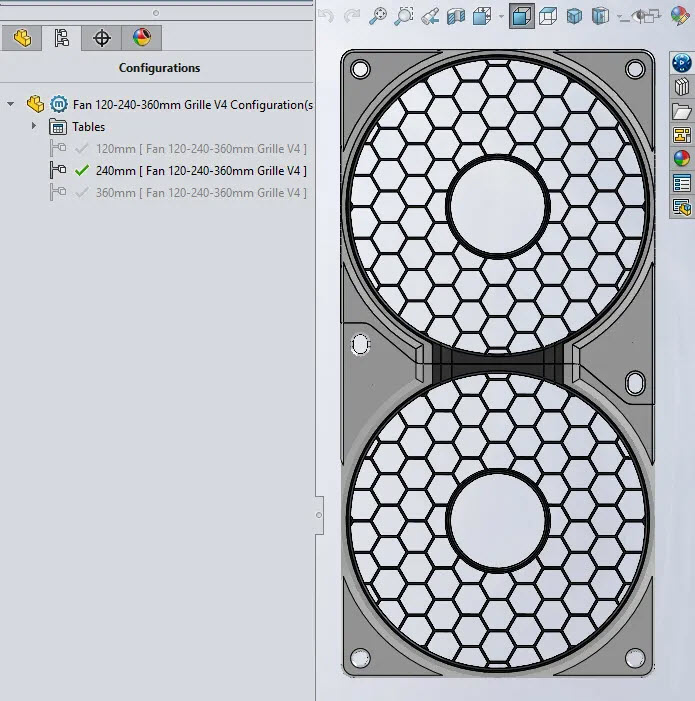 Designed in SolidWorks for Makers, this parametric design contains three configurations for single, double or triple and more fans, in double or more configurations, the screw tabs overlap the following frame and reduces mounting screws. The grille also “connects” to the next one enhancing the seamless design.