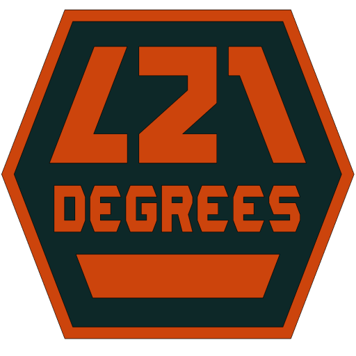 It’s a shield, showing “L21” in big bold letters and “DEGREES” in a custom font. Very geometric, almost mechanical, all angles measure 21° or a variation of it. The colors (which are still in the air) are burnt orange and misted black, bonus points to whoever recognizes the paint palette this is coming from.