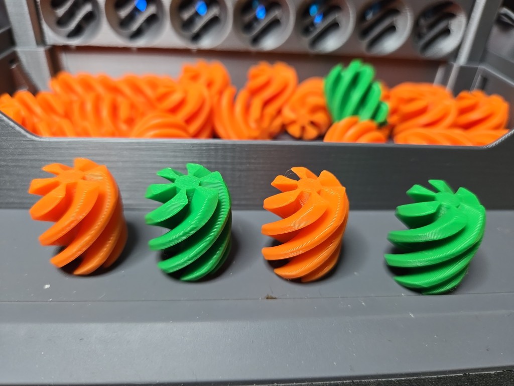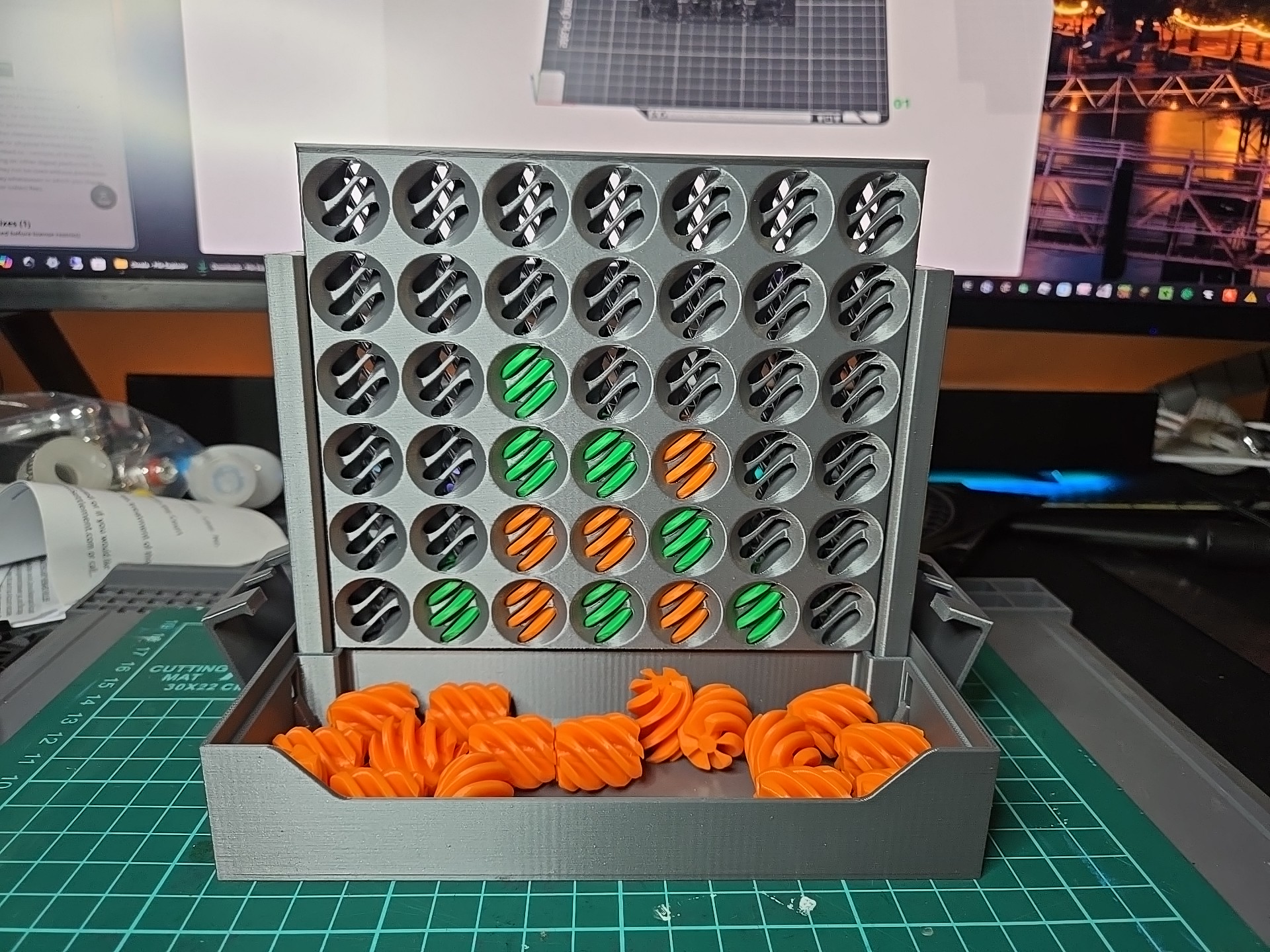 This is an awesome “spin” on this classic game, only reasonably possible with additive manufacturing. Every column is a spiral cut all the way from the top to bottom, the pieces are shaped as an offset of the spiral cuts which slide down slowly in a very satisfying drop.