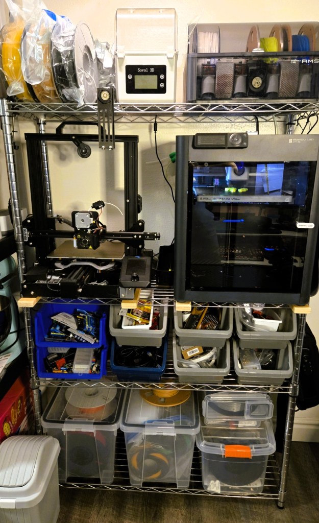 Top shelf: filament dispensing and storage, there’s some recently used filament spools inside vacuum sealed bags, a dual filament dryer which I use to also dry desiccant and the amazing Bambu Lab AMS (Automatic Material System) which is the next biggest thing for 3D printing. I got this AMS as a bundle with the P1S and I totally love it, besides multi-color printing, it contains four material/color spools ready to go at any given time in a semi-sealed container. I printed desiccant containers to add inside to help reduce/eliminate moisture.