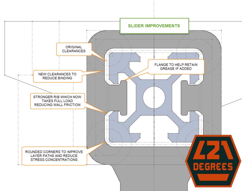 The image below shows the changes but in summary, I increased the side clearances to reduce/eliminate wall friction, strengthened the slider ribs and added a flange to help retain grease if added, and increased corner fillets (rounding) to reduce/eliminate stress concentrations: