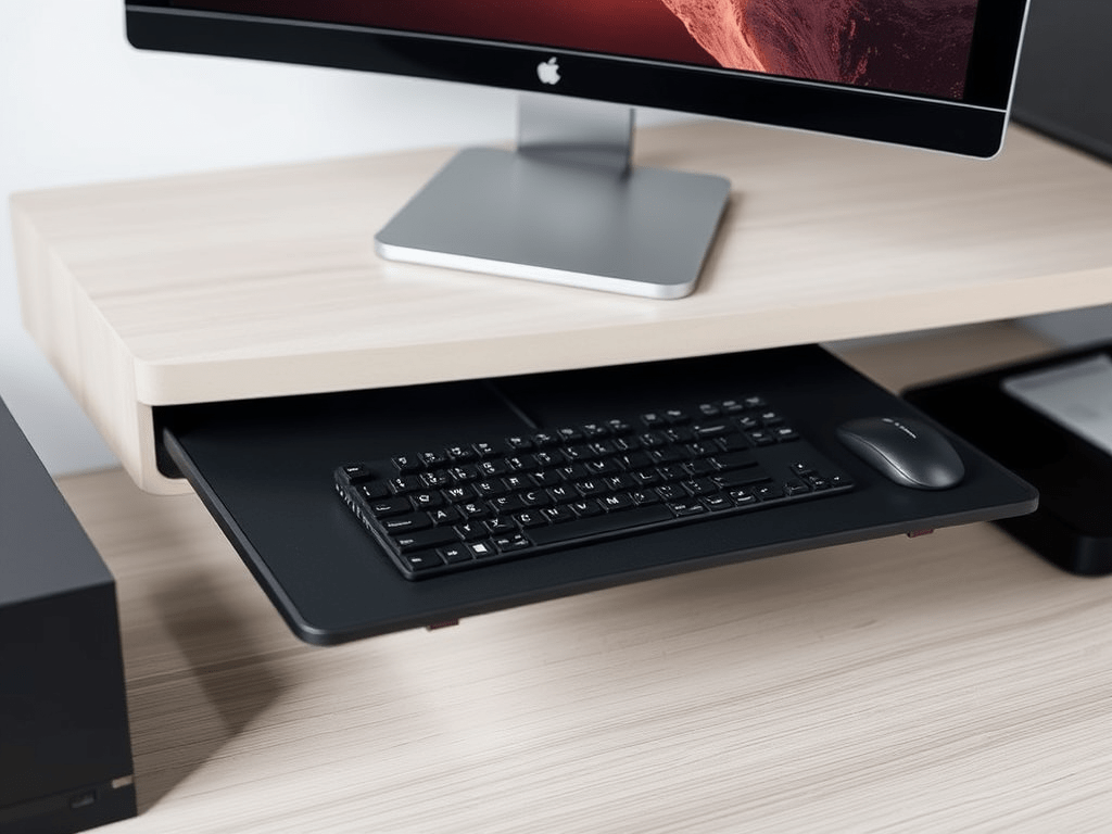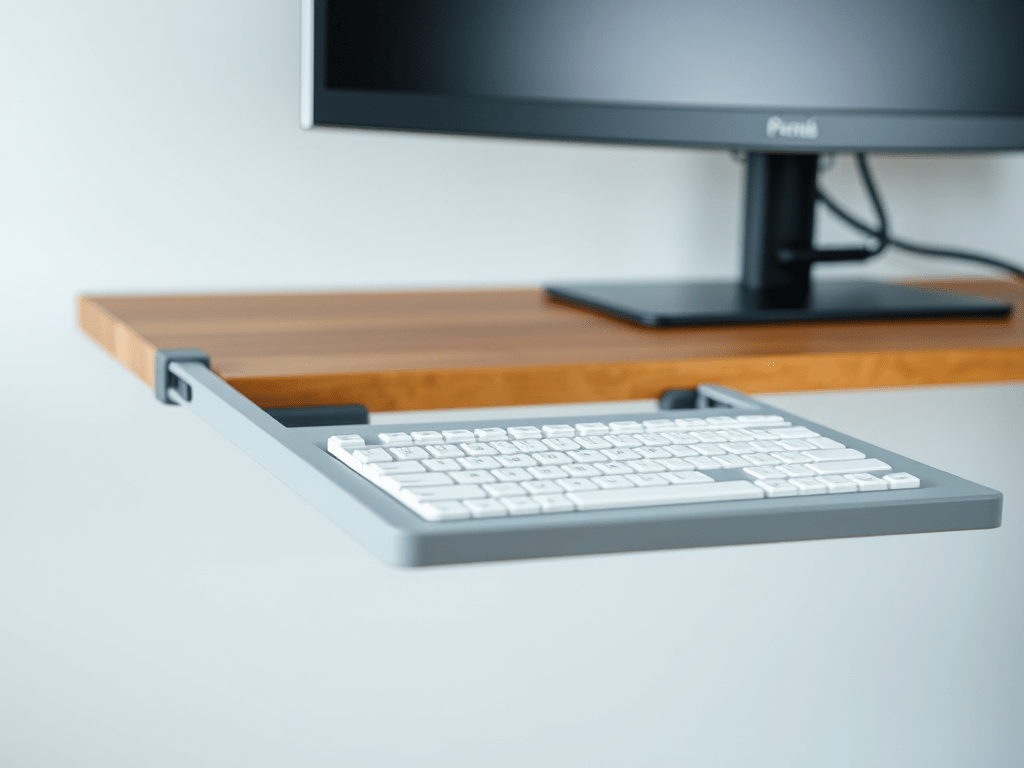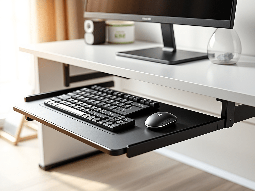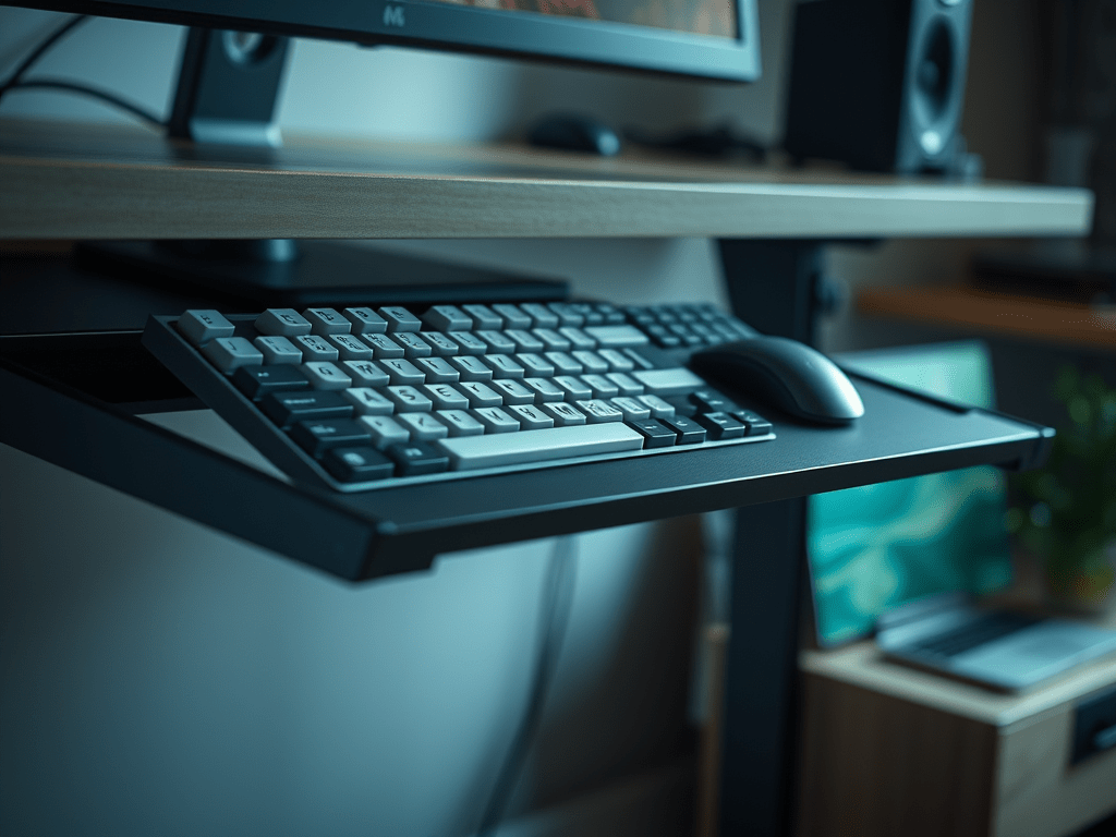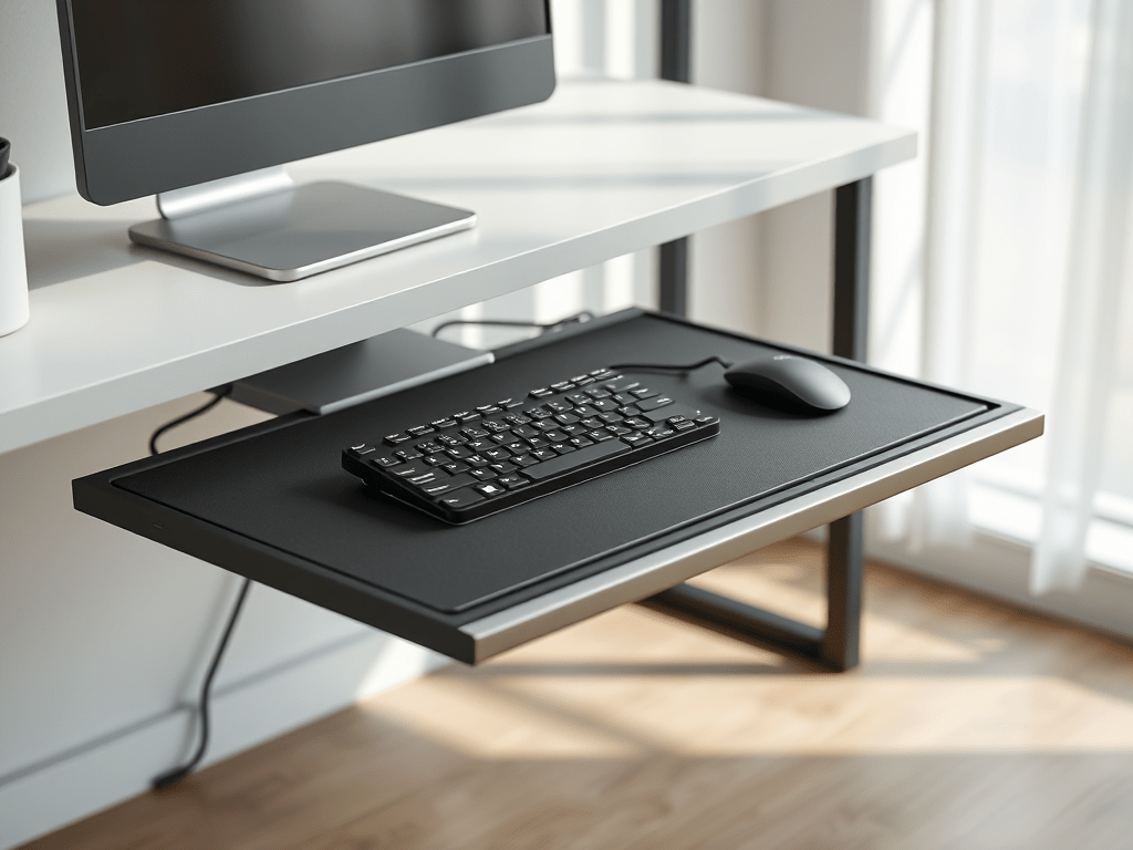 Hi! This design is the result of my need to free desk space and lower the keyboard height as the desk is too tall for me. I spent over an hour looking for sliding keyboard trays and none met my needs/wants.