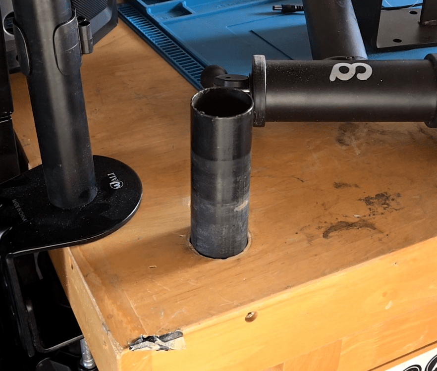 The old one was mounted by getting its main tube through the top and hose clamps to the leg. The new one had a huge bracket that could either be screwed to the wall or to a countertop. I already had a big tube firmly attached to the bench so I wanted to reuse that. Well, the new stand’s tube is bigger than the old one’s so I needed to add a spacer to it and there’s a million ways to do that. I have CAD and a 3D printer so I took that route.
