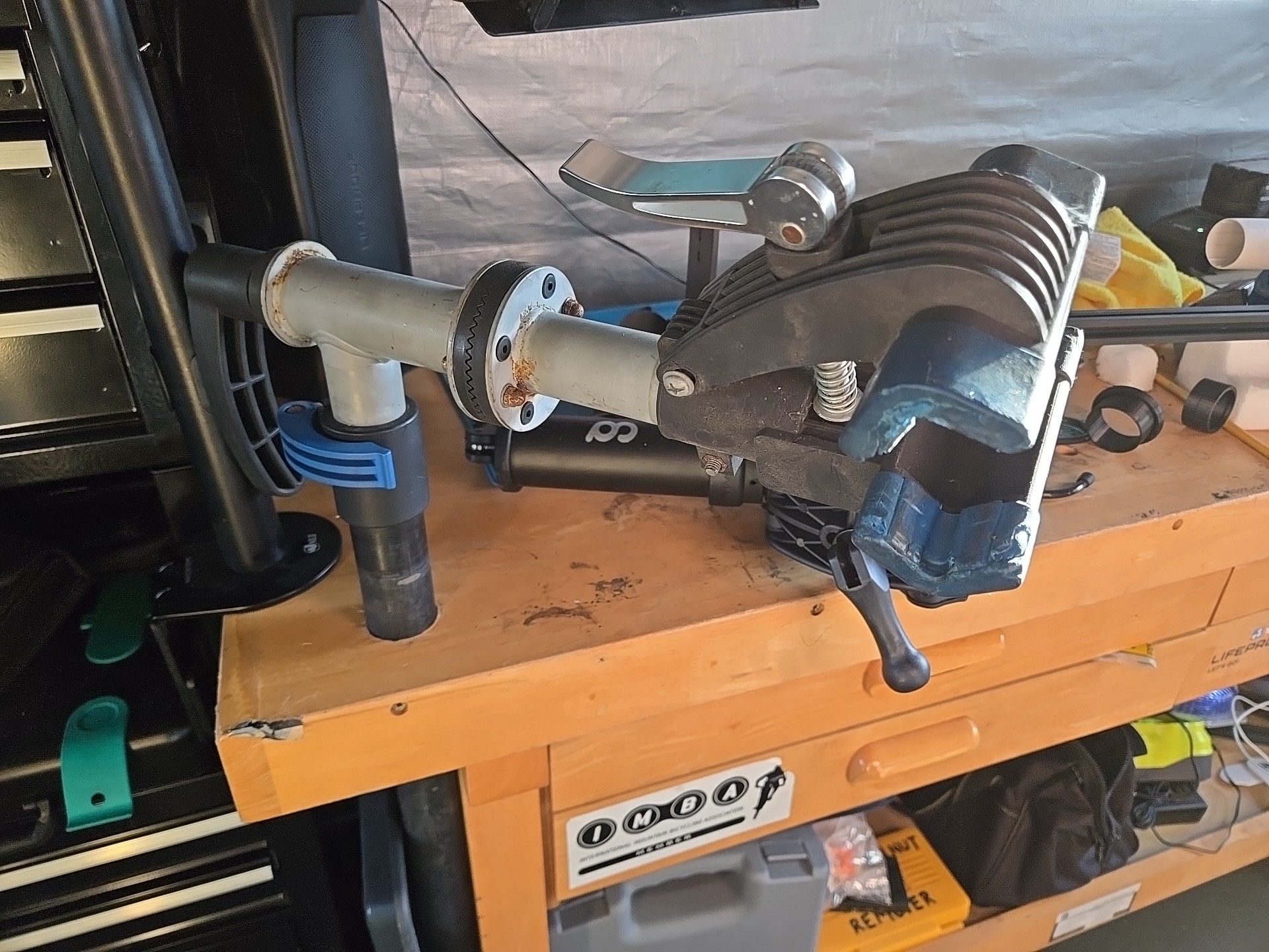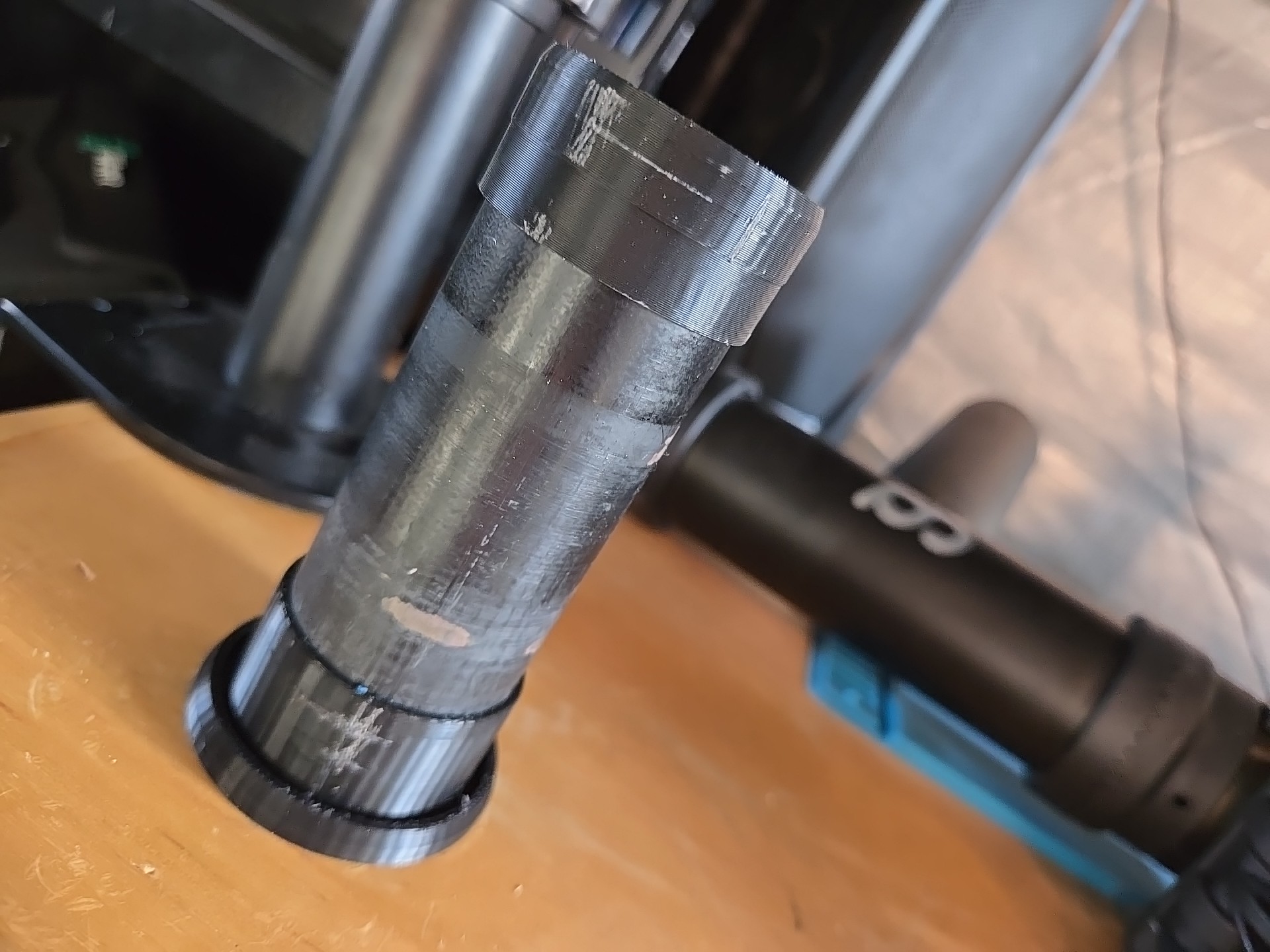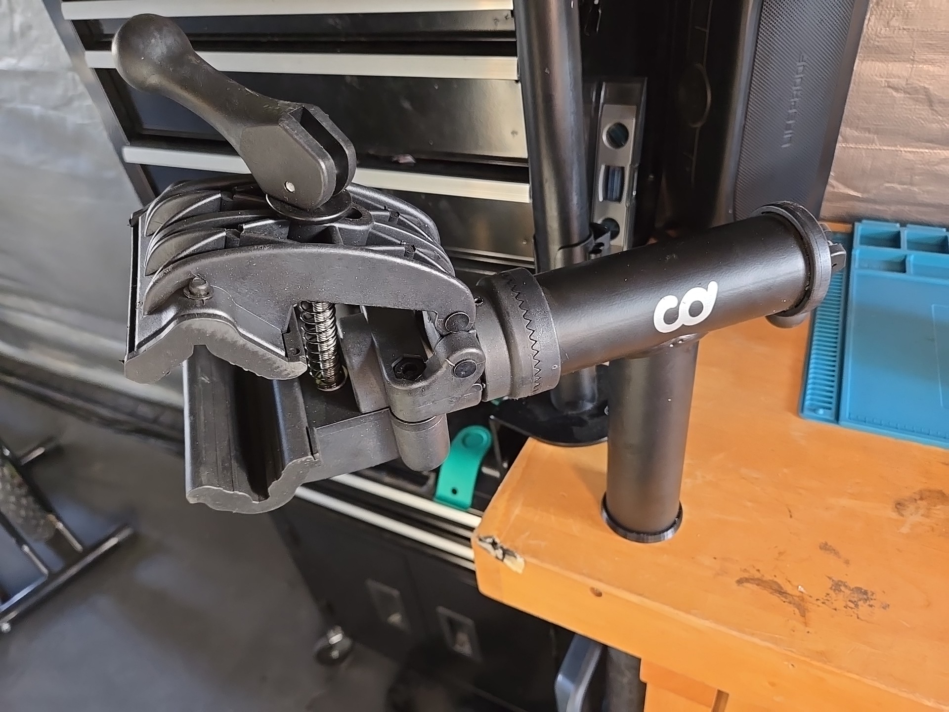 What would I have used if I didn’t have a 3D printer? Masking tape? I don’t know, what would be your approach with your skills and equipment? Machining? Turning? Getting rid of the tube and screw the stand to the wall or bench? My bike “shop” is a 7ft x 5ft portable shed so no walls and didn’t want to reduce the bench top area with the big bracket.