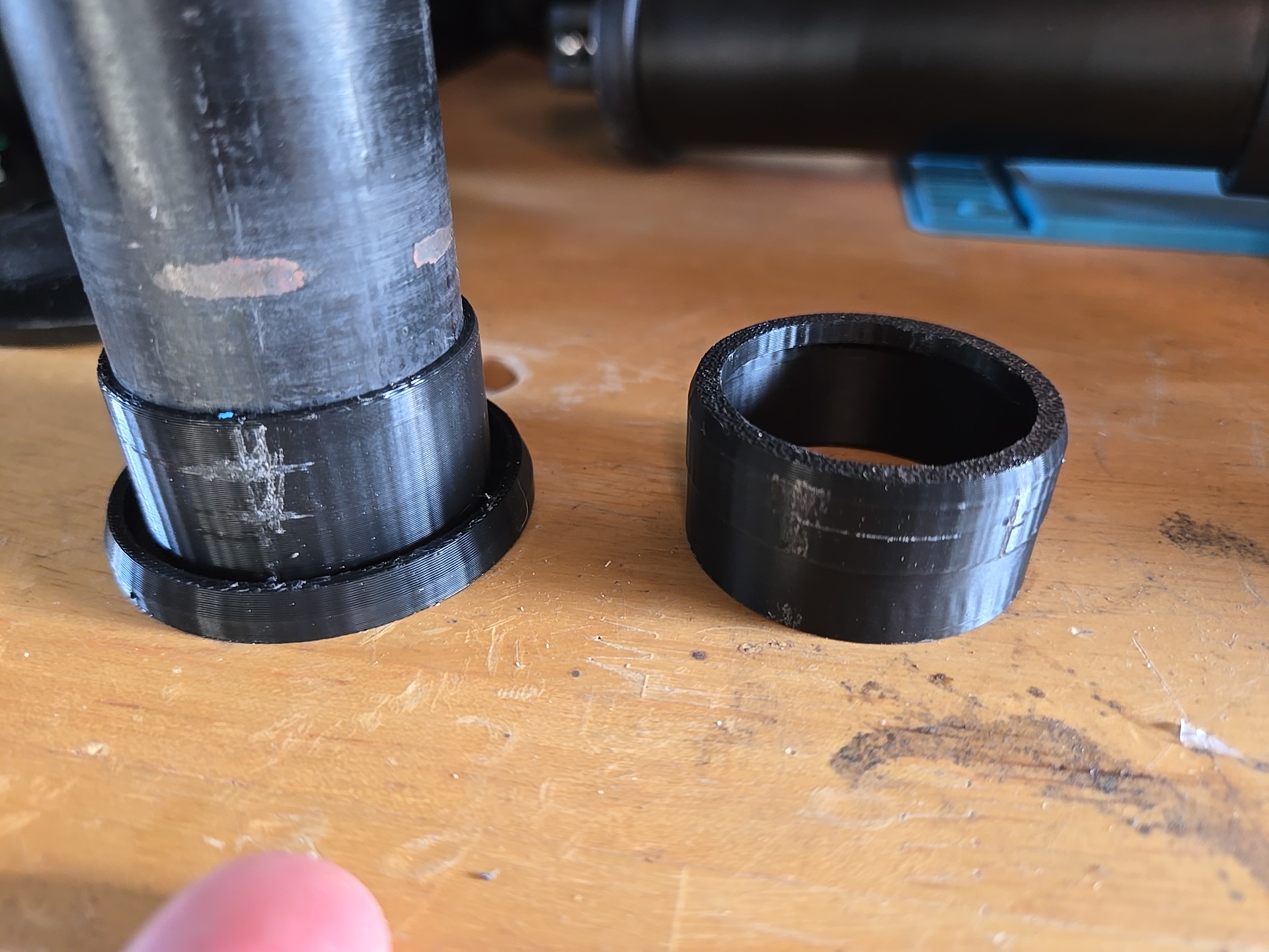 The fixed tubing protruded about 5 inches from the benchtop, but the spacer didn’t have to go the whole way through, I didn’t want both to bind and also it was an unneeded waste of material and time, so I thought of making it in two parts, a base and a cap.