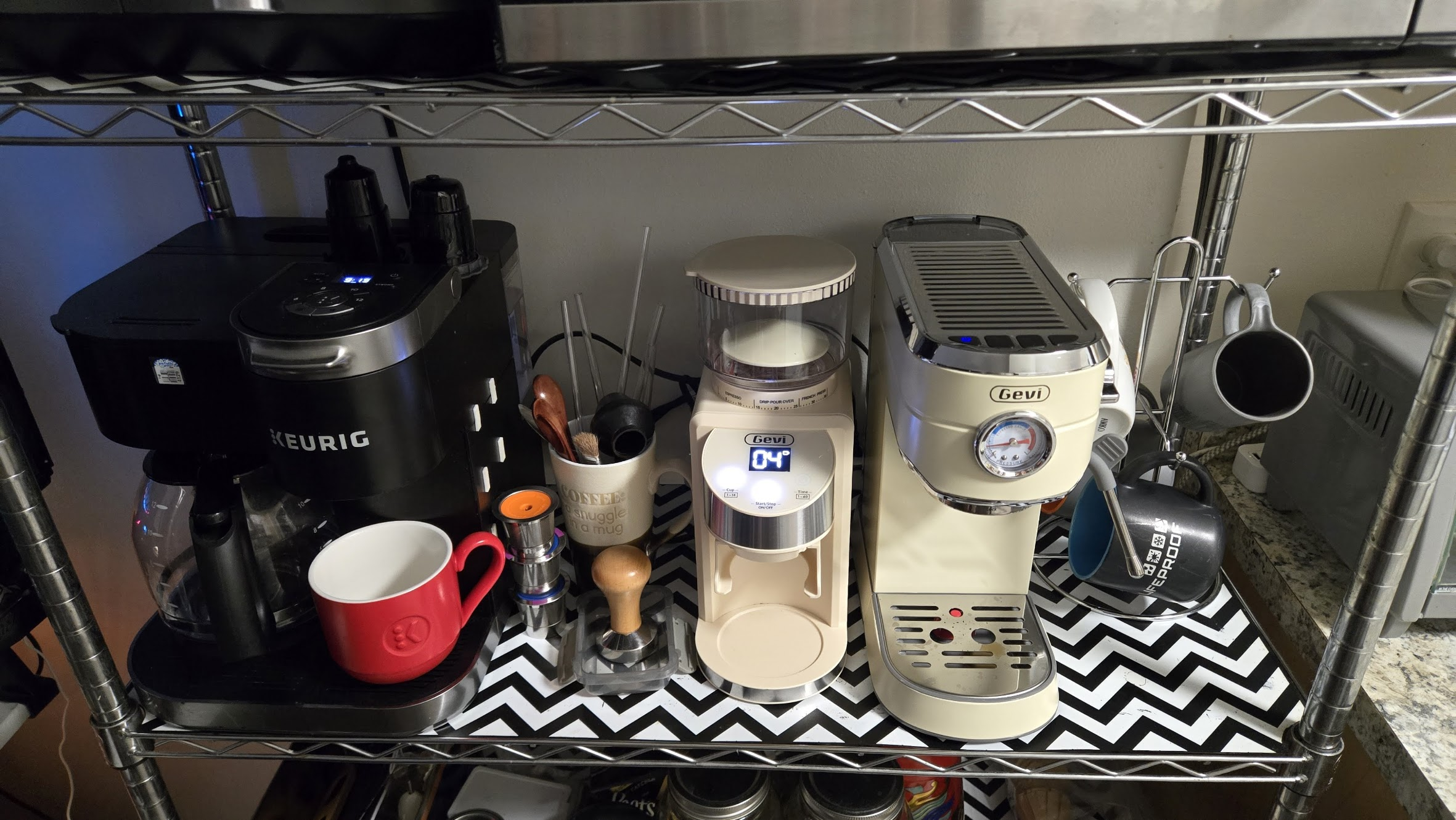 Like my list of semi-abandoned hobbies didn’t need to grow, I just replaced my Nespresso Vertuo Breville machine with a cheap set of coffee grinder and espresso machine with a steam wand which included a nice tamper and a chrome frothing jug along other small accessories. Since then, I’ve added a “bottomless” portafilter and a kit that contained a portafilter funnel, a WDT tool, a filter plate and a brush. I just received a tamping/knock box station. How did it go? I’ll go back to this in a bit.