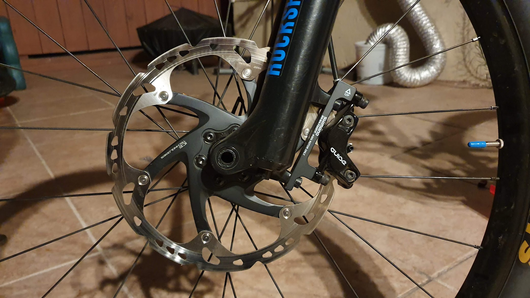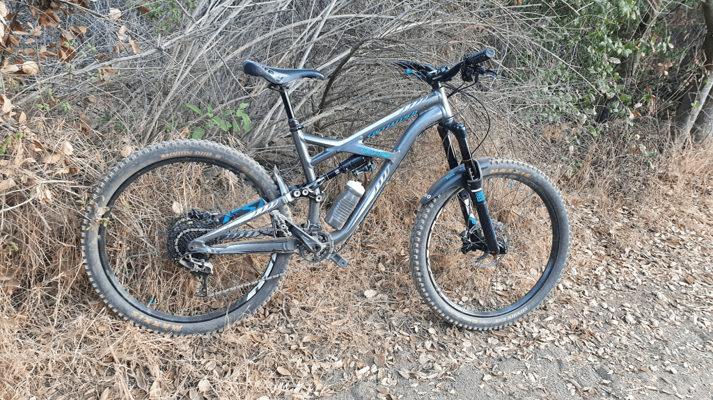 (writeup coming soon) this is a placeholder for a 2015 Specialized Enduro build, bigger wheels, bigger brakes, rugged tires, suspension, etc. Gray and black with white and light blue accents, 3×9 converted to 1×11, 11-42T